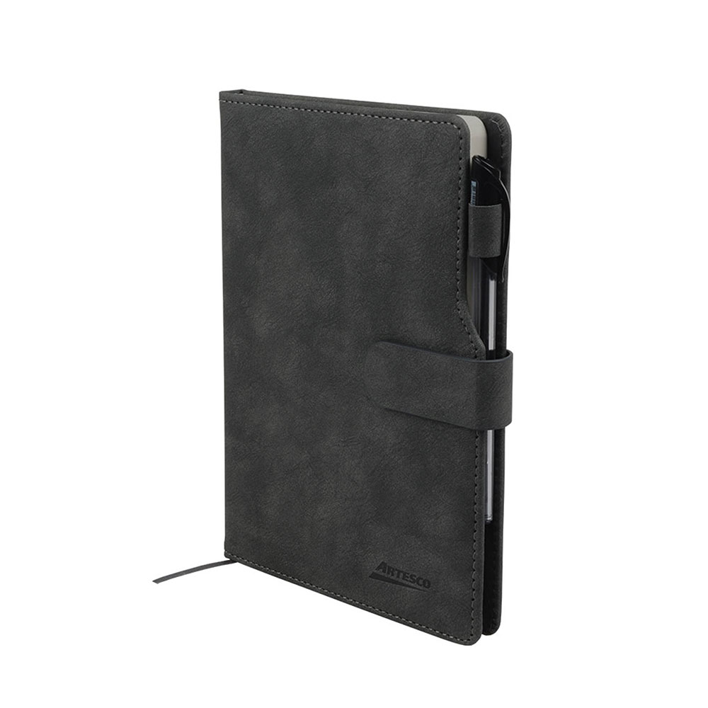Libreta con seguro imantado y hojas rayadas de 80 gr. Material con acabado tipo cuerina. Incluye lapicero Trimax GL32 de regalo.